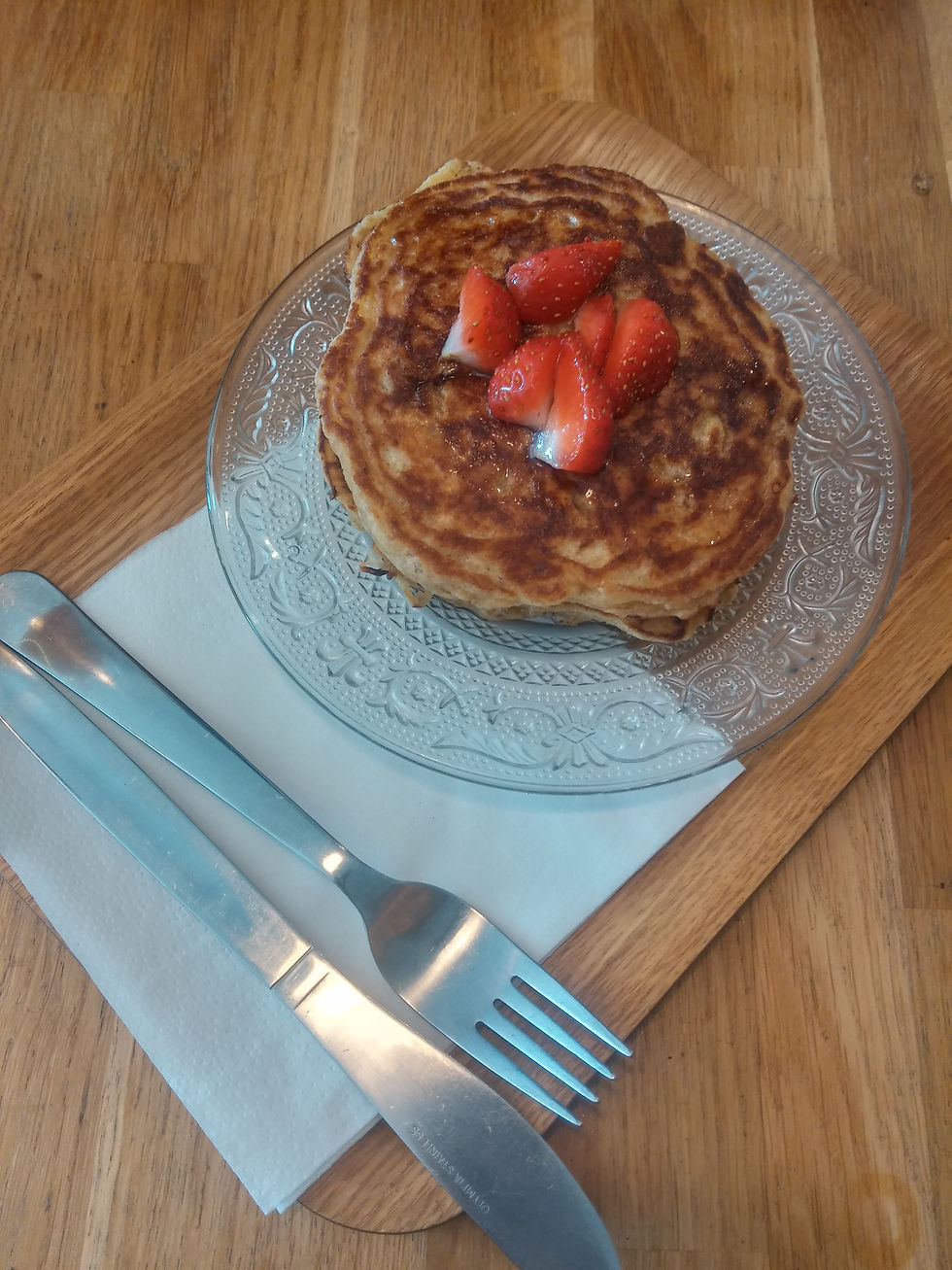 Pour terminer avec une note sucrée, les pancakes aux myrtilles semblaient tout indiqués. Servis avec quelques morceaux de fraises et de bananes.